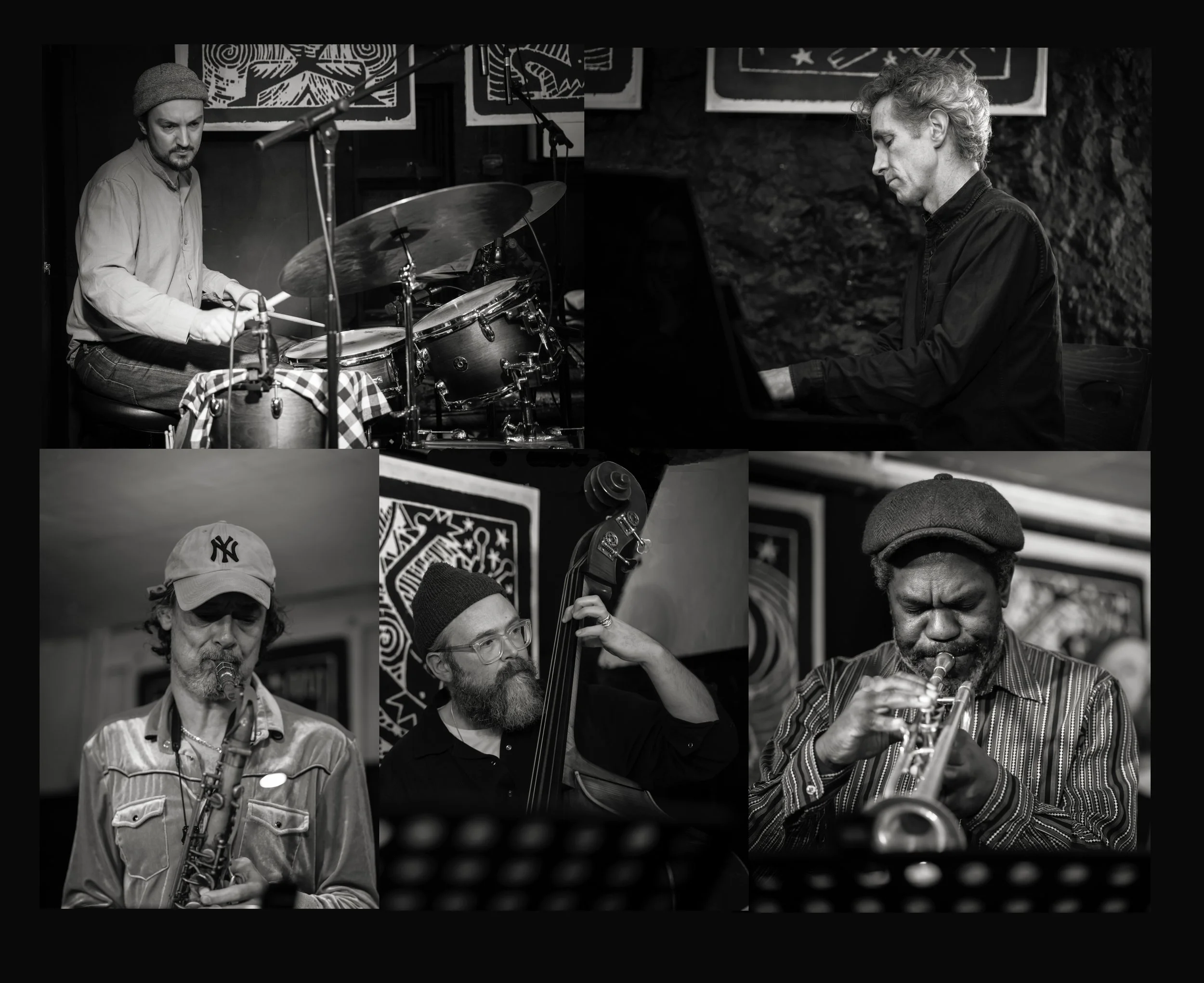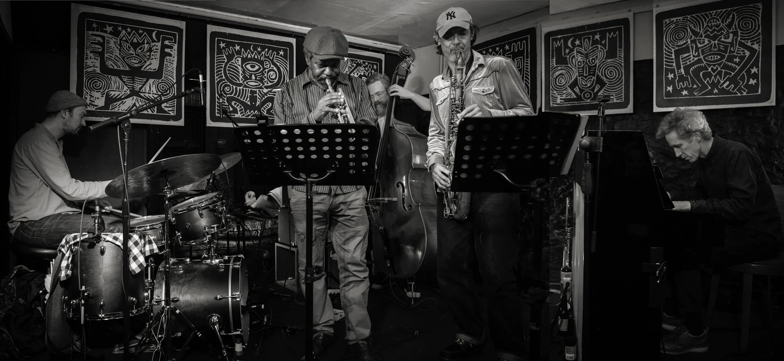 This all-acoustic line-up of piano, double bass and drum kit is augmented by two horns – tenor saxophone and trumpet. In much of the writing you will hear the horns playing together like, for example, in the Miles Davis bands of the fifties and sixties. Aside from modern jazz roots, stylistically, the material draws from a wide palette of influences: Brazilian, Cuban, Ghanaian music, contemporary funky flavours, minimal and abstract moments.